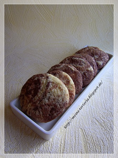 Den Ofen auf 175 Grad Ober-/Unterhitze vorheizen. Backbleche mit Backpapier belegen. Abwechselnd dunklen und hellen Teig in eine Schüssel geben. Mit einer Gabel durchziehen, sodass ein leichtes Marmormuster entsteht.