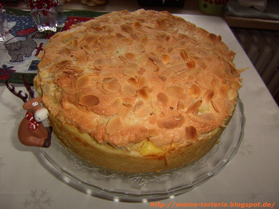 Den Kuchen bei 180 Grad Ober-/Unterhitze 30 Minuten vorbacken. In der Zwischenzeit das Eiweiß steif schlagen. Den Zucker kurz unterschlagen. Nach Ablauf der Backzeit den Kuchen aus dem Ofen nehmen, die Oberfläche mit der Baisermasse bestreichen und mit den gehobelten Mandeln bestreuen.