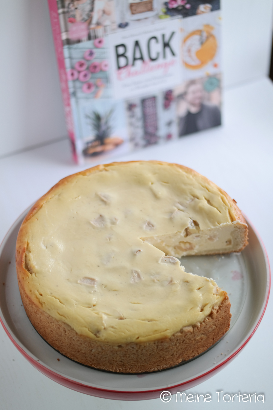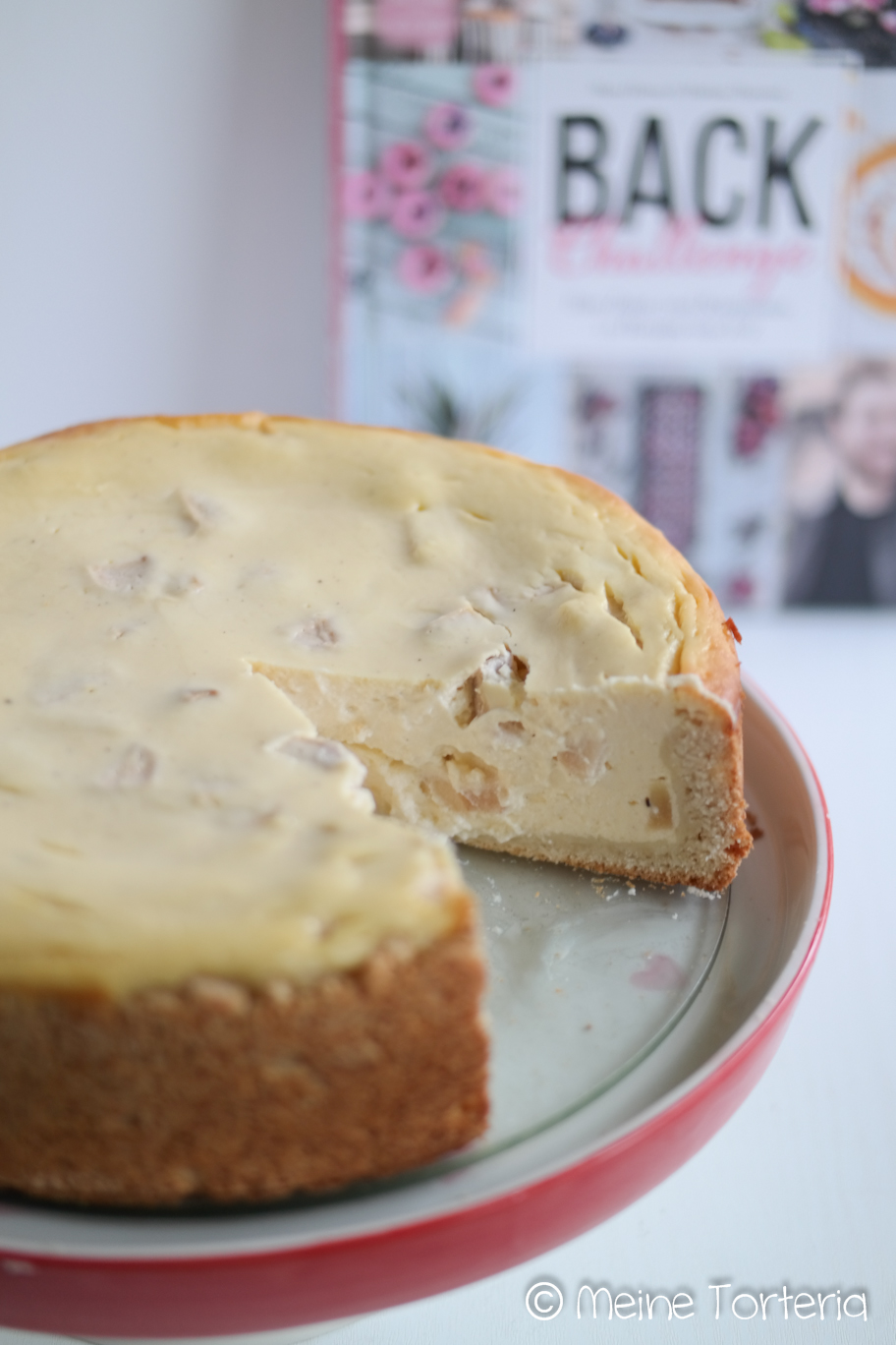 Alle Zutaten – außer den Äpfeln – gründlich miteinander verrühren. Die Äpfel entkernen, in kleine Würfel schneiden und unterheben. die Füllung auf den Boden geben und glatt streichen.