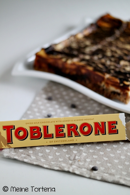 Toblerone hacken und gleichmäßig auf dem vorgebackenen Boden verteilen. Ein Drittel der Schokoladensauce darübergießen und die Frischkäse-Masse vorsichtig auf die Schokolade geben.