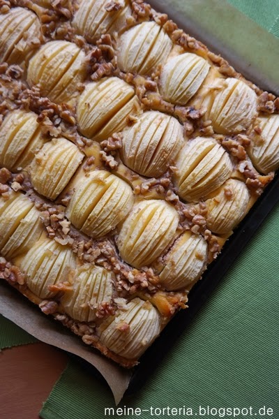 Den Teig auf das Blech verstreichen. Die Marzipanmasse darauf verteilen und dann die Äpfel mit den Schlitzen nach oben darauf verteilen. Mit gehackten Walnüssen bestreuen und im vorgeheizten Ofen auf mittlerer Stufe bei 190 Grad Ober-/Unterhitze ca. 40 – 45 Minuten backen. Die Oberfläche sollte schön goldgelb sein.
