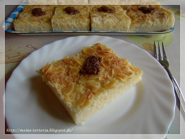 Den Teig auf ein tiefes Backblech gießen. Zucker und Kokosraspel mischen und auf den Teig streuen. Mandelblättchen (war bei mir etwas mehr als ein halber Beutel) darüber verteilen.