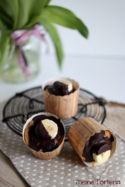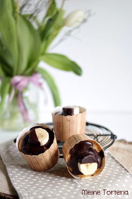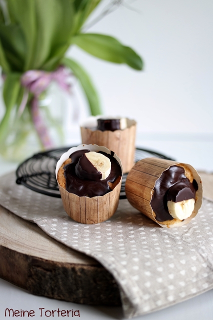 Als Dekoration habe ich noch etwas übrig gebliebene Schokoglasur von einem anderen Backwerk und eine Bananenscheibe darauf verteilt.