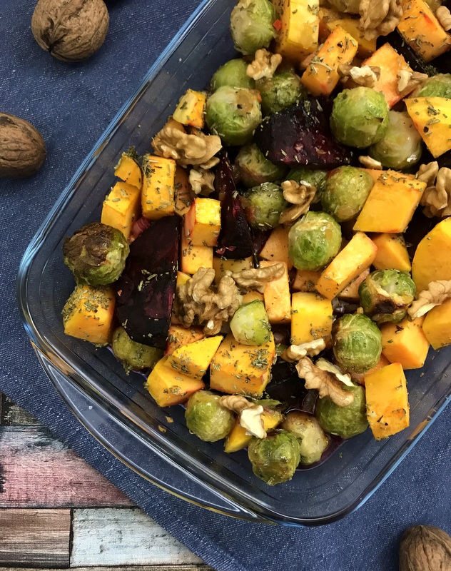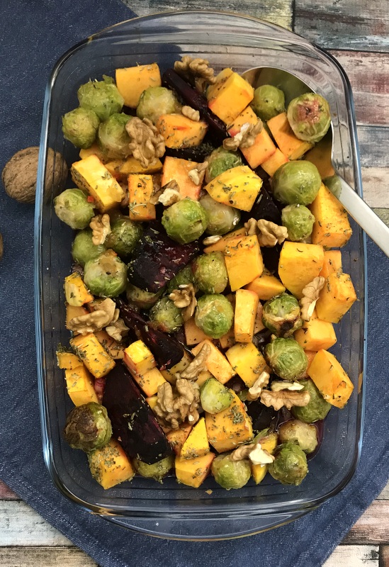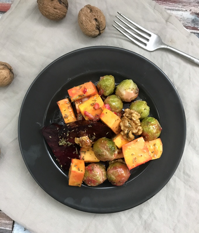 Zuerst das Gemüse vorbereiten: Die rote Bete schälen und in dünne Spalten schneiden, (wenn sie zu dick sind, ist die rote Bete nach der Garzeit noch nicht durch). Den Rosenkohl putzen und halbieren, den Kürbis schälen, die Kerne mit einem Löffel entfernen und in ca. 1 x 1 cm große Würfel schneiden. Die Zwiebel pellen und fein würfeln.