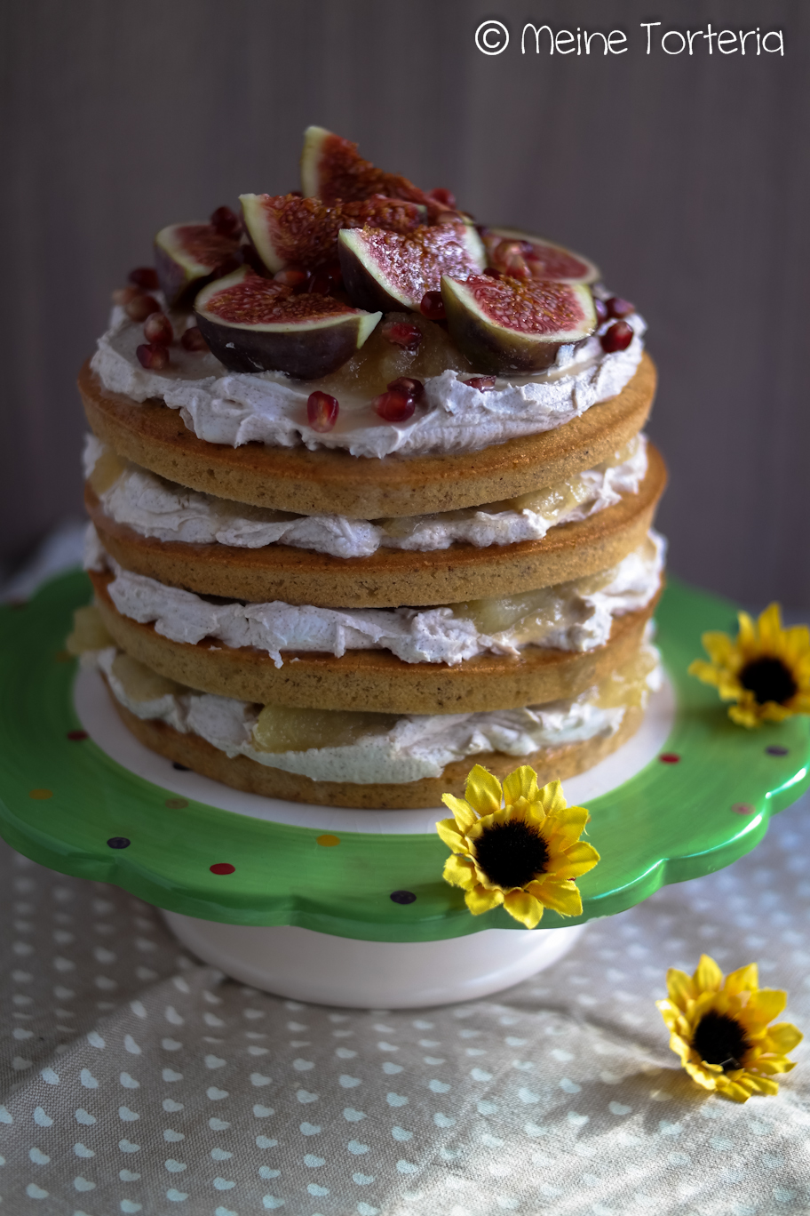 Jetzt geht es ans Stapeln. Den ersten Boden auf eine Tortenplatte legen. 1/4 der Mascarponecreme darauf glattstreichen und 1/4 vom Kompott darauf verteilen. Danach den 2. Boden auflegen und wieder mit Creme und Kompott belegen, gefolgt vom 3. und 4. Boden immer schön im Wechsel mit Creme und Kompott. Auch auf den obersten Boden Creme und Kompott geben.