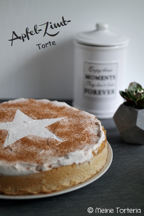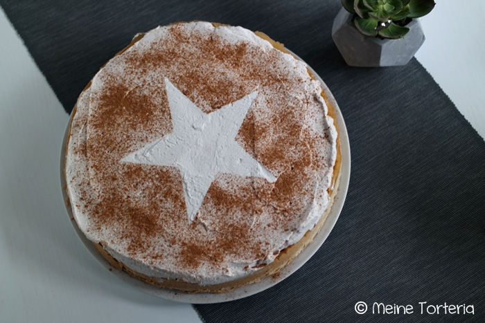 Am nächsten Morgen die Sahne mit dem Zimt, Vanillezucker und Sahnesteif steif schlagen, auf der Füllung verteilen und glattstreichen. Ich habe aus Papier noch einen Stern ausgeschnitten, auf die Sahne gelegt und Zimt darüber gestreut. Den Papierstern entfernen und schon hat mein ein hübsches Muster auf der Torte.