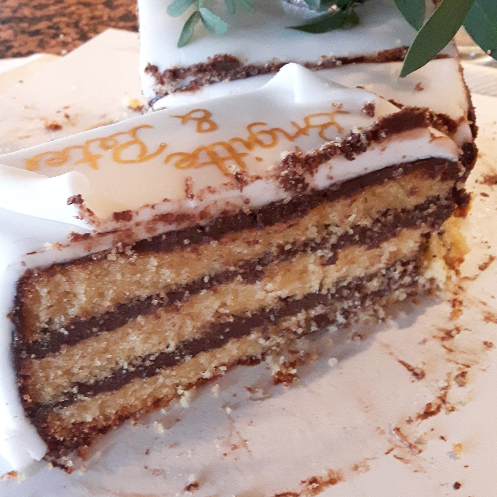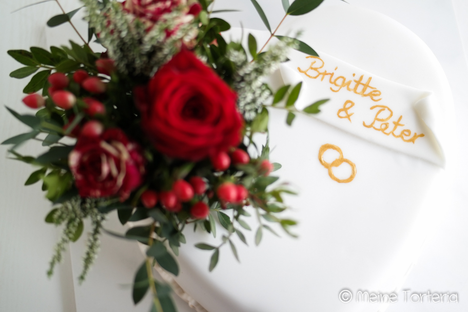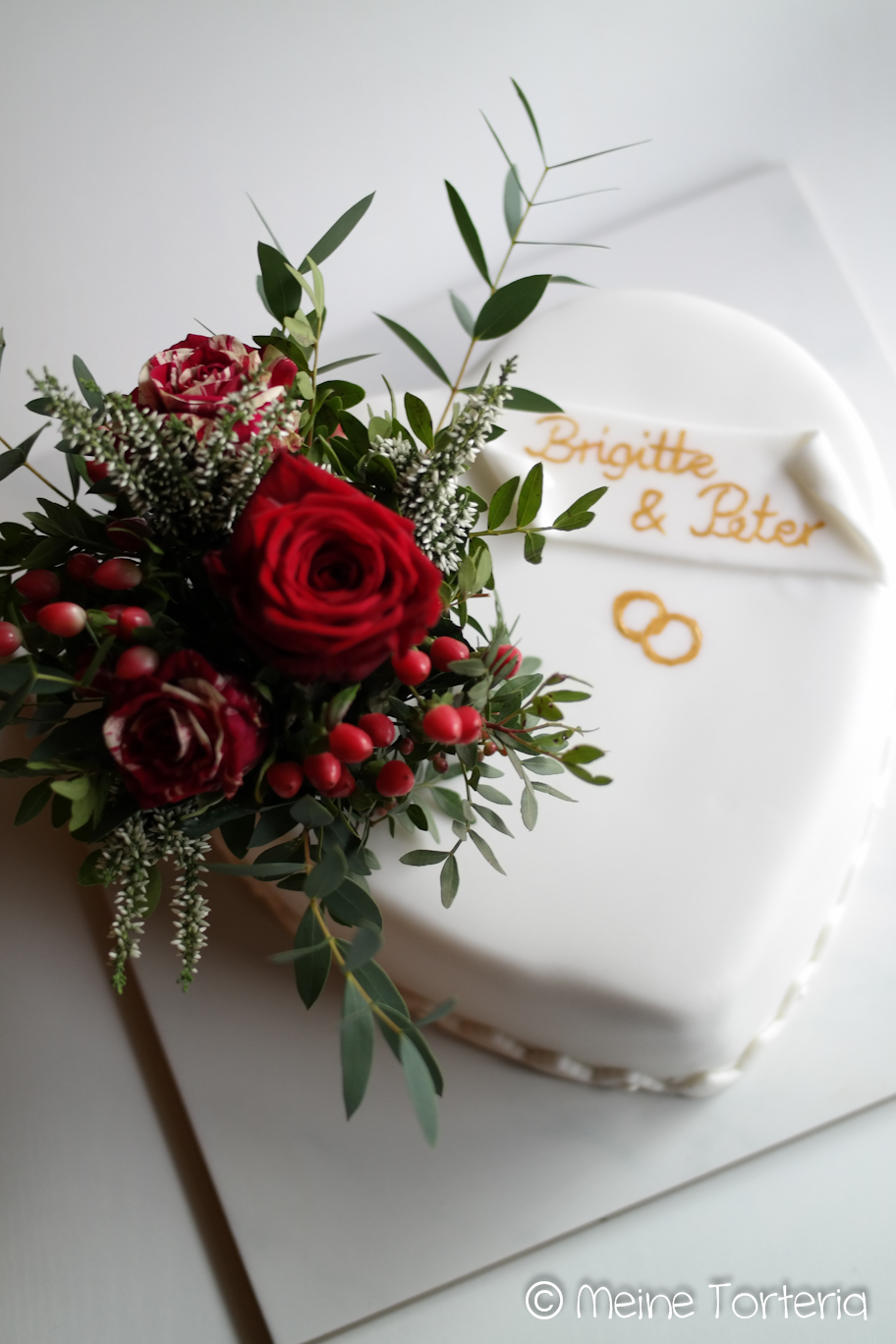 Aber eine Hochzeit so ganz ohne eine richtige Hochzeitstorte ist doch keine Hochzeit oder? Also habe ich nach der Arbeit noch zwei Nachtschichten eingelegt und eine kleine herzförmige Torte gezaubert. Obwohl – so klein war die gar nicht. Letztlich war sie über 4 kg schwer. Die Backform für das Herz entspricht vom Inhalt her einer Springform mit 26 cm Durchmesser. Und an Füllung habe ich auch nicht gegeizt. Mehrstöckig habe ich zeitlich leider nicht geschafft und die hätte sich auch bei der Anzahl der Gäste nicht wirklich gelohnt.
