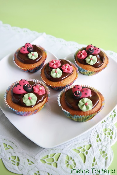 Dieses Mal habe ich zwei Eier benutzt und einen guten Schwups Schokodrops in den Teig gegeben. Dekoriert habe ich mit Kuvertüre und niedlichen kleinen Blüten und Käferchen, die ich bei einem Gewinnspiel auf Instagram von der lieben Jasmin – klick – gewonnen hatte.