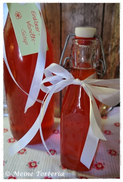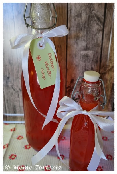 Und da ich Sirups im Sommer liebe (Holunderblüten- und Rhabarbersirup sind schon fertig), habe ich mich aus dem Buch für Erdbeer-Vanille-Sirup entschieden.
