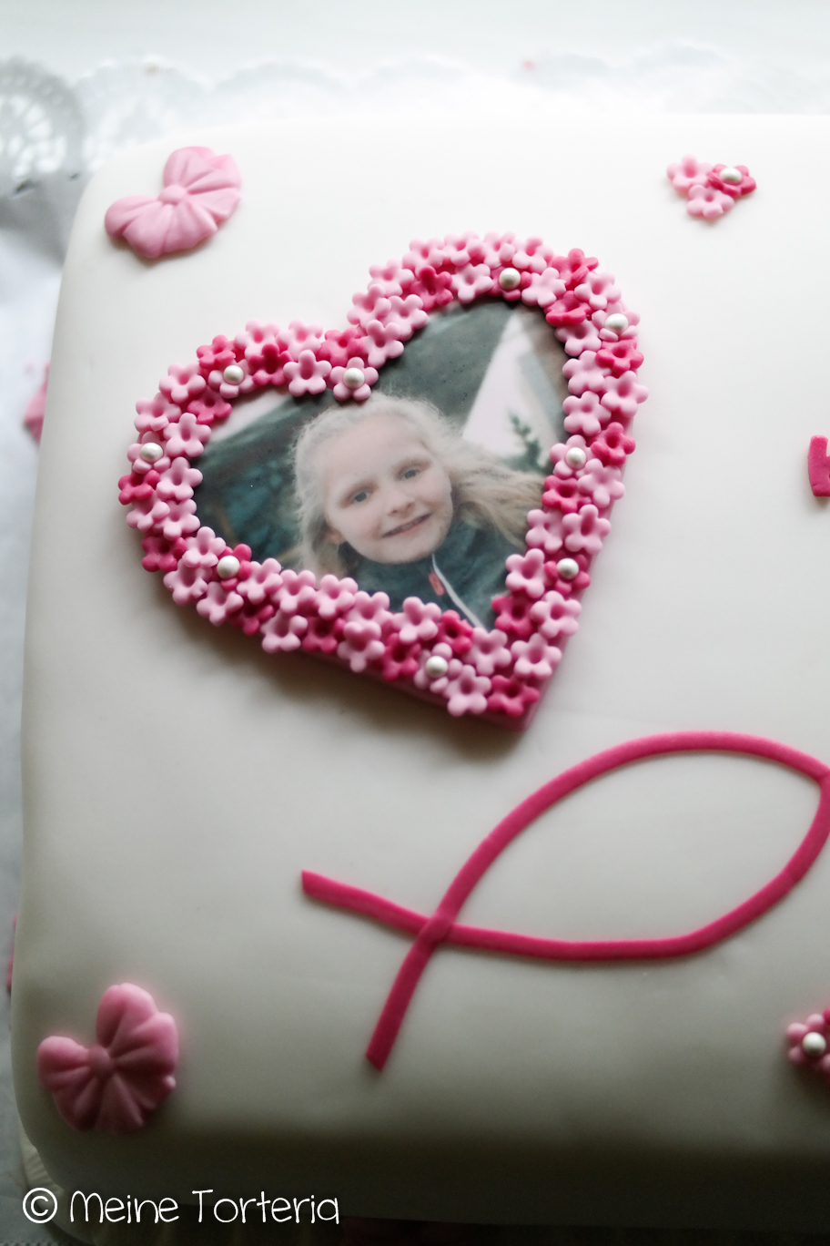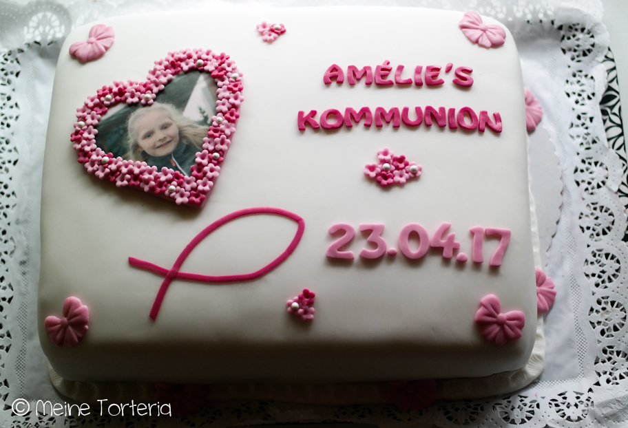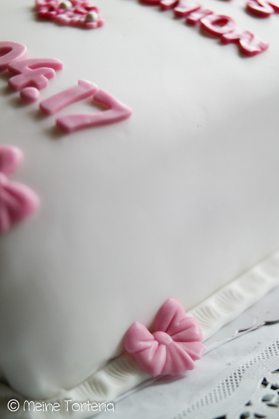 Unter dem Fondant verbirgt sich mein Lieblingsrezept – klick -, das ich 3 x auf einem Backblech gebacken habe (mit je 6 Eiern), einmal davon mit Kakao. Als Füllung kamen 4 kg Erdbeer-Mascarpone-Creme zum Einsatz. Es soll ja schließlich nach etwas schmecken. Das Rezept findet Ihr auch bereits hier: Klick. Diese Kombination schmeckt aber auch einfach immer lecker. Und farblich passt die Creme natürlich auch noch zum Tortendesign. ☺