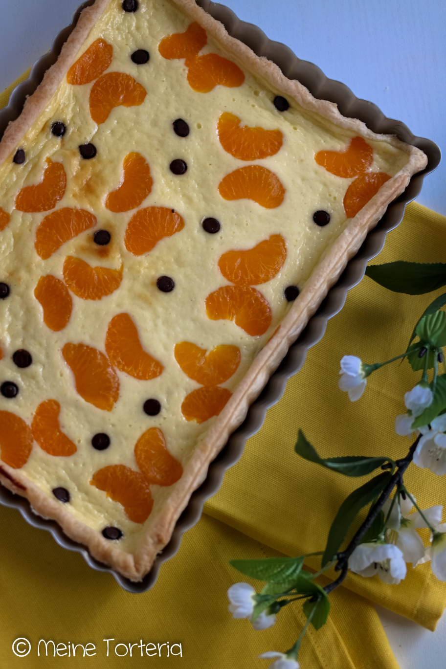 Die Eier mit dem Quark, dem Zucker und dem Zitronenabrieb verrühren und auf dem Blätterteig verteilen und glatt streichen. Die Mandarinen auf der Quarkmasse verteilen. Ich habe sie „Rücken an Rücken“ gelegt, so sehen sie aus wie kleine Schmetterlinge finde ich. Ein paar Schokotröpfchen ggf. in die Lücken verteilen und ab in den Ofen mit der Tarte.