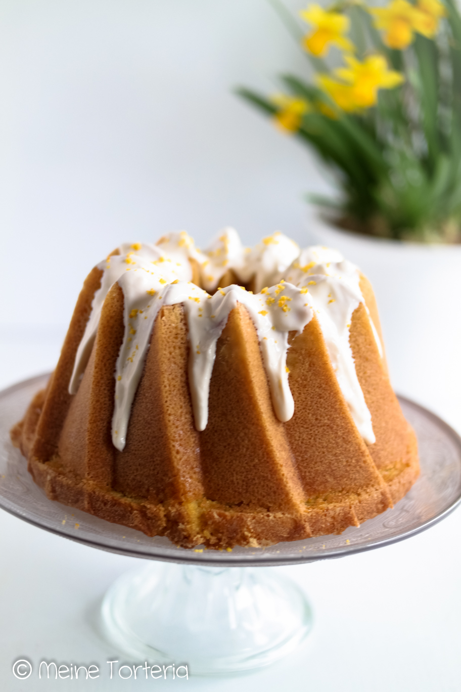 Auf den ausgekühlten Kuchen verteilen und mit etwas Orangenschale bestreuen. Fertig ist ein sehr saftiger und säuerlich schmeckender Gugelhupf.