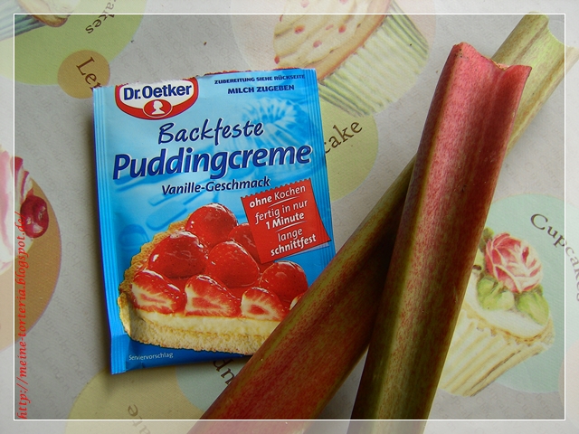 Gestern doch glatt ausprobiert… frei Schnautze natürlich, weil ich meine Probetütchen backfesten Pudding nicht finden konnte ;-) hab ich halt Garant genommen – ging auch! Allerdings hab ich meine Tarteforme genommen und den Rhabarber in Stücke geschnitten. Dazu gabs handgeschlagene halbfeste Vanille-Sahne (die Tarte war noch lauwarm)