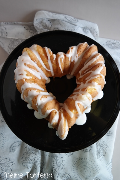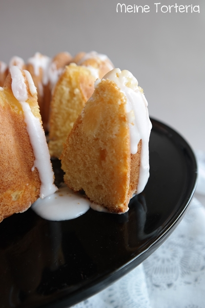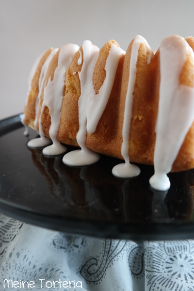 Für den Guss habe ich den Puderzucker mit Rum verrührt. Es müssten so ca. 2 EL gewesen sein, das habe ich leider vergessen, mir zu notieren. Fangt einfach mit einem Löffel Rum (oder alternativ Zitronensaft oder Wasser) an und geht langsam so viel Flüssigkeit dazu, bis ein zähfließender Guss entstanden ist. Den könnt Ihr dann über den ausgekühlten Kuchen verteilen.